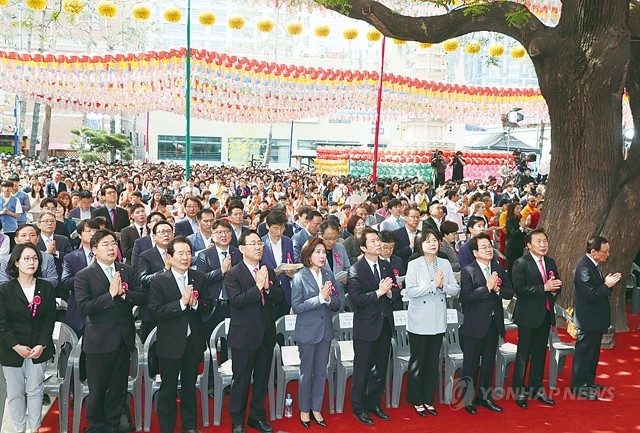 불기 2563년 부처님오신날인 12일 오전 서울 종로구 조계사에서 열린 봉축법요식에서 더불어민주당 이해찬 대표(오른쪽부터), 바른미래당 손학규 대표, 민주평화당 정동영 대표, 정의당 이정미 대표, 더불어민주당 이인영 원내대표, 자유한국당 나경원 원내대표 등이 합장하고 있다.
