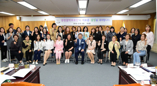 서울 중랑구는 지난 10일 오전 구청 기획상황실에서 지역내 초·중·고교 학부모로 구성된 ‘중랑꿈 학부모단’ 위촉식을 열고, 학부모단의 역할 및 활동방향에 대한 교육도 함께 실시했다. 사진은 류경기 구청장(앞줄 가운데) 및 학부모들이 기념촬영을 하는 모습. (사진제공=중랑구청)