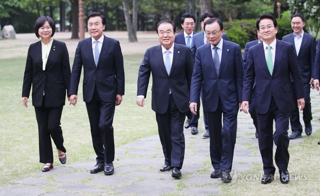 문희상 국회의장(가운데)이 13일 국회 사랑재에서 열린 국회의장 주최 초월회 오찬 간담회에 참석한 각 당 대표들과 입장하고 있다. 왼쪽부터 정의당 이정미 대표, 바른미래당 손학규 대표, 문 의장, 더불어민주당 이해찬 대표, 민주평화당 정동영 대표.