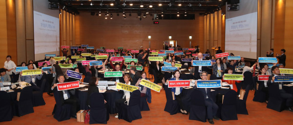 경기 화성시가 주최하고 화성환경운동연합이 주관, 환경부·해양수산부·문화재청·대양주 철새이동경로 파트너십(EAAFP)이 후원하는 ‘화성습지 생태·환경 국제심포지엄’이 13일 롤링힐스 호텔에서 열렸다. 사진은 참석자들이 플래카드 세리머니를 하고 있는 모습. (사진제공=화성시청)