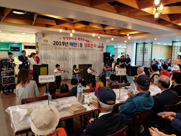 경기 수원시 영통구 매탄1동 단체 연합회는 최근 지역내 노인 1300여명을 초청해 오전 11시부터 4시간여 동안 2019년 매탄1동 경로잔치를 개최했다. 사진은 이날 행사에 참여한 어린이들이 바이올린 연주를 선보이는 모습. (사진제공=수원시청)