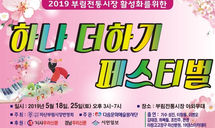 한편,2019 부림전통시장 활성화를 위한 ‘하나 더하기 페스티벌’행사는 (사)마산부림전통시장번영회가 주최하고 봉사단체 다솜문화예술봉사단이 주관하는 공연으로 가수 성진,이창용,이병오,김태경,하복둘,조민주,은정,아랑고고장구 마산분원,19댄스아카데미 회원들이 출연한다.이날 후원에는 시민일보,시사우리신문,경남우리신문이 후원한다.
