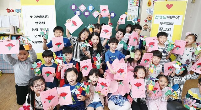 스승의 날을 하루 앞둔 14일 오후 경기 수원시 장안구 파장초등학교에서 2학년 학생들이 직접 만든 카네이션을 보여주고 있다.
