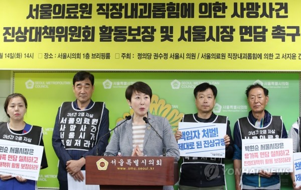 마지막으로 권 의원은 "‘서울시 자살예방 및 생명존중문화조성을 위한 조례’에 명시된 서울시장의 책무에 따라 박원순 시장이 하루빨리 유족 및 시민대책위원 면담 요청에 응해 사망사건 진상규명에 대한 의지를 보여줄 것"을 촉구했다.