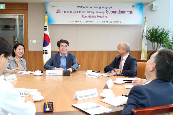 지난 13일 서울 성동구청에 유네스코평생학습연구소 관계자들이 방문해 글로벌 평생학습도시 네트워크의 최근 동향과 정책전망 등에 대해 논의했다. 사진은 유네스코평생학습연구소 관계자들과 정원오 구청장(가운데)이 대화를 나누는 모습. (사진제공=성동구청)