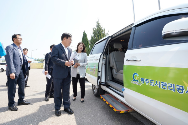 신동헌 경기 광주시장이 14일 유승하 광주도시관리공사사장 및 나종윤 안전교통국장 등과 함께 교통약자 이동지원센터를 방문해 희망콜택시 탑승체험 및 현장소통을 실시했다. 사진은 신 시장과 관계자들이 희망콜택시를 둘러보고 있는 모습. (사진제공=광주시청)