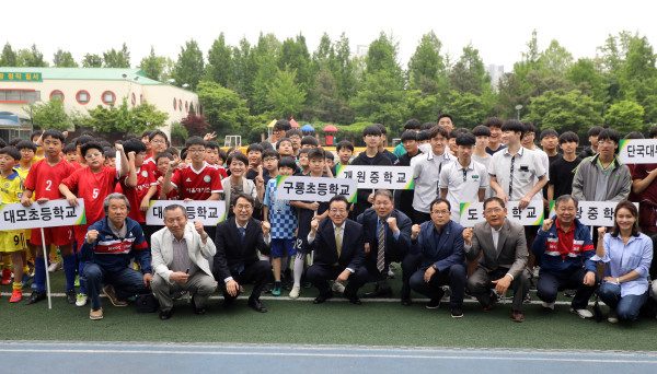 서울 강남구는 최근 대치동 대치초등학교에서 ‘제22회 강남구청장기 소년축구대회’를 개최했다. 사진은 이날 행사에 참석한 정순균 구청장(앞줄 오른쪽에서 여섯 번째)과 참가 초등학교 학생들 및 관계자들이 파이팅을 외치고 있는 모습. (사진제공=강남구청)