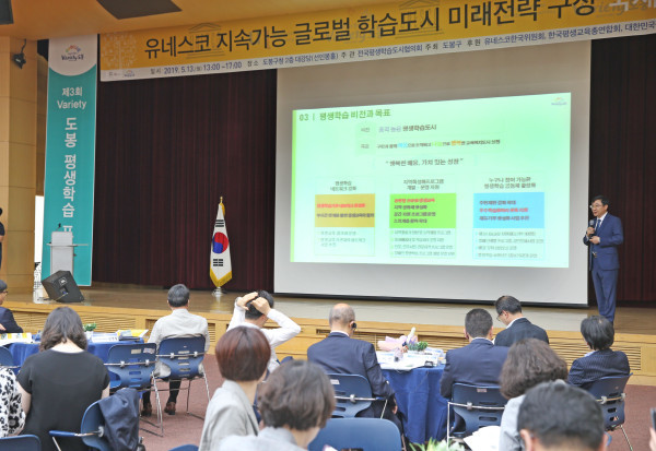 서울 도봉구는 최근 구청 선인봉홀에서 전국의 평생교육 전문가, 유네스코 국제평생교육기구 소장 등이 참석한 가운데 ‘유네스코 지속가능 학습도시 미래전략 구상 국제포럼’을 개최했다. 사진은 이동진 구청장이 사례를 설명하고 있는 모습. (사진제공=도봉구청)