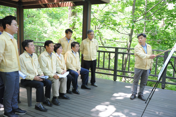 서울 양천구의회 복지건설위원회는 최근 제271회 임시회 일정으로 '신정2-2구역 주택 재개발 정비사업' 공사현장과 '계남근린공원 데크길'을 방문했다. 사진은 위원들이 계남근린공원에 방문해 공원녹지과 관계자로부터 데크길 조성현황을 보고받는 모습. (사진제공=양천구의회)