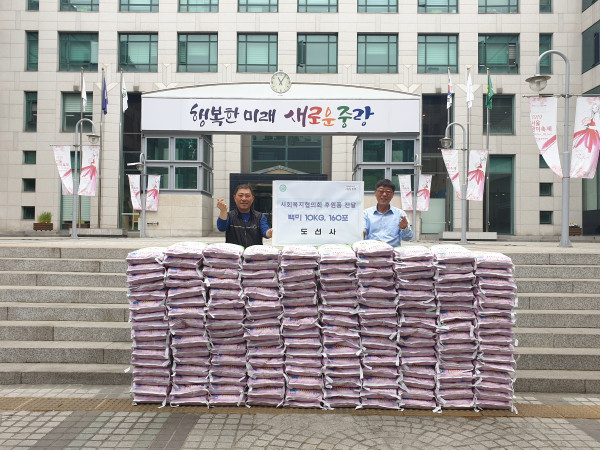 서울 중랑구는 지난 17일 오전 11시 구청 중앙광장에서 대한불교조계종 도선사와 함께 ‘사랑의 쌀 전달식’을 가졌다. 사진은 전달식에 참여한 관계자들이 기념촬영을 하는 모습. (사진제공=중랑구청)