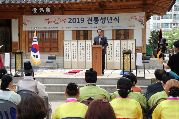 서울 마포구는 최근 광흥당에서 성년의 날을 기념해 마포문화원 주관으로 ‘2019 전통성년식’을 개최했다. 이날 2000년생 남녀 3명씩 전통 관례복장을 갖추고 성년선서 등을 했다. 사진은 행사에 참석한 유동균 구청장이 인사말을 전하는 모습. (사진제공=마포구청)