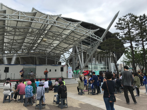 경기 수원시 팔달구는 지난 18일 오후 3시 수원월드컵경기장 중앙광장에서 ‘팔달구 우리동네 버스킹’ 공연을 개최했다. 사진은 시민들이 3인조 인디밴드 ‘STOPS’의 공연을 구경하는 모습. (사진제공=수원시청)