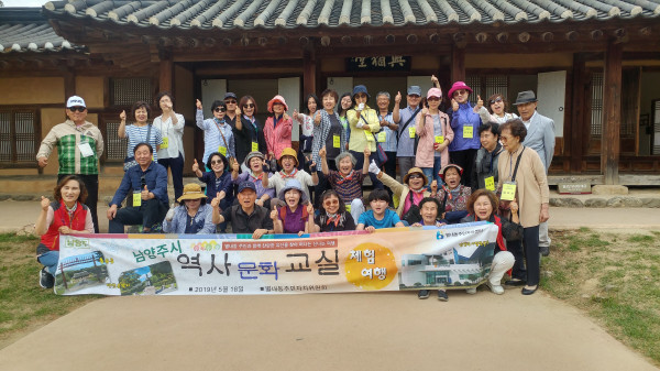 경기 남양주시 별내동 주민자치위원회는 최근 별내동에 거주하는 주민 40여명을 대상으로 역사 인식을 고취시키고자 ‘남양주 역사문화교실 체험 여행’ 프로그램을 운영했다. 사진은 이날 프로그램에 참가한 주민들이 기념촬영을 하는 모습. (사진제공=남양주시청)