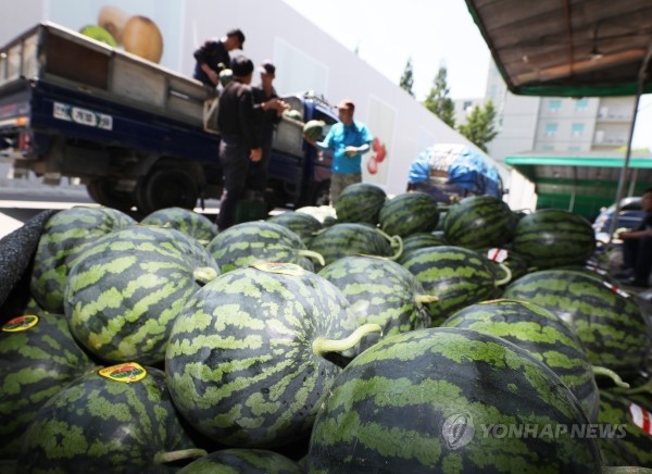 22일 오후 경기도 수원시 권선구 수원농수산물도매시장에서 관계자들이 트럭에 실린 수박을 내리고 있다.