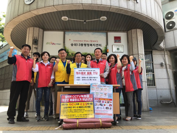 인천 미추홀구 숭의 1·3동 행정복지센터와 한국마사회 미추홀지사는 23일 무단투기 금지 및 재활용 배출요령을 안내하는 홍보물 전달식을 개최했다. 전달식 후 도시형생활주택 밀집지역의 골목길을 청소했다. 사진은 기념촬영을 하는 모습. (사진제공=미추홀구청)