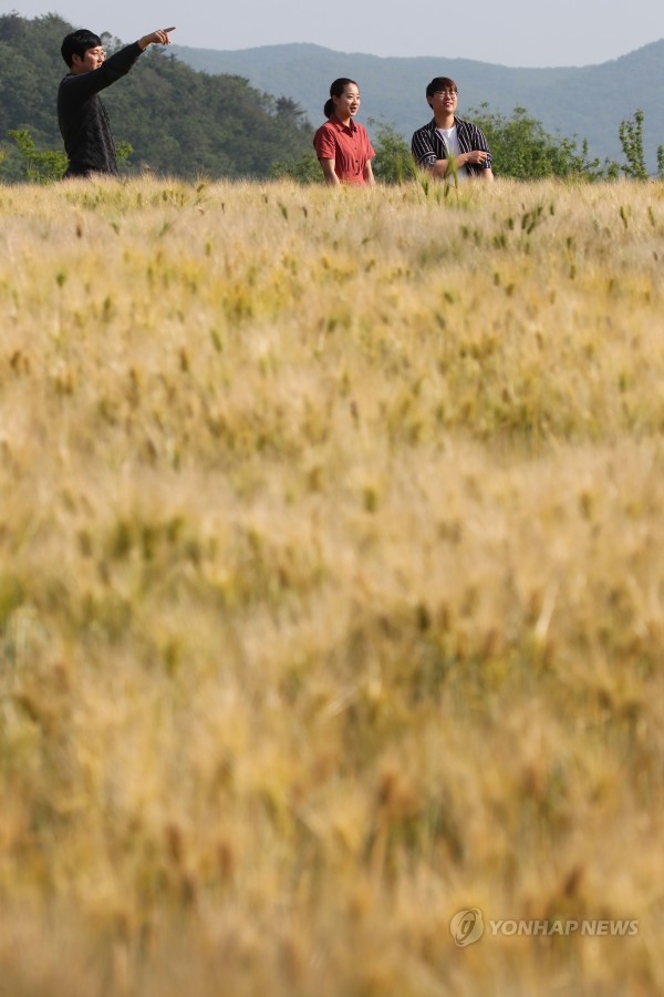 22일 인천 옹진군 백령면 북포리에 펼쳐진 보리밭에서 주민들이 산책하고 있다.