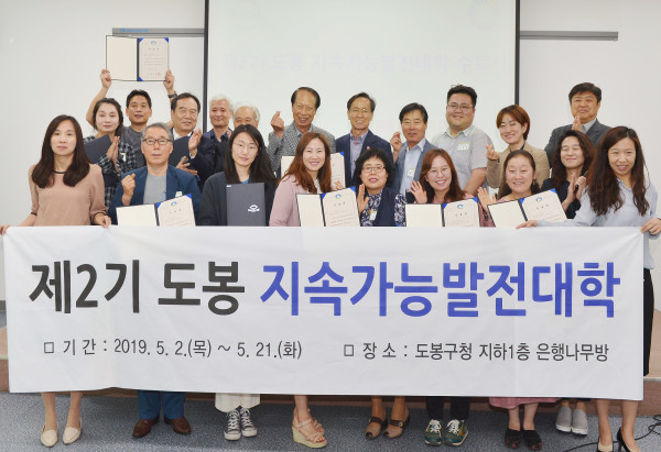 서울 도봉구는 최근 구청 은행나무방에서 구민 및 지속가능발전위원회 위원 30여명을 대상으로 ‘제2회 도봉 지속가능발전대학 수료식’을 개최했다. 이날 수강생들은 그룹 토론 및 발표를 하고 교육을 마무리했다. 사진은 기념촬영을 하는 모습. (사진제공=도봉구청)