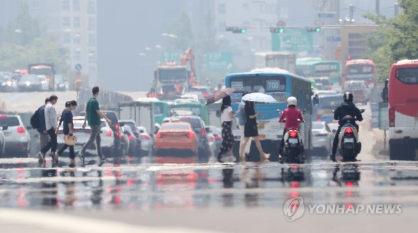 전국 곳곳에 폭염주의보가 내려진 23일 서울 여의도의 뜨거워진 도로에서 아지랑이가 피어오르고 있다.
