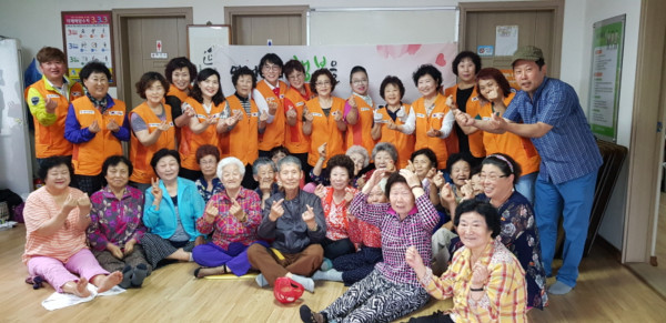 경기 연천봉사단이 27일 초성2리 노인정에서 ‘복화술로 찾아가는 행복 전도사’ 봉사활동을 실시했다. 이날 봉사단원 15명은 마을노인들을 위해 발마사지, 웃음치료, 복화술 인형 공연 등을 했다. 사진은 함께 기념촬영을 하는 모습. (사진제공=연천군청)