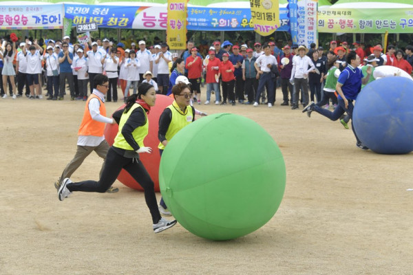 서울 광진구는 지난 25일 뚝섬한강공원 축구장에서 ‘제24회 광진구민의날 기념식 및 구민체육대회’를 개최했다. 사진은 대회 참여자들이 '큰 공 굴리기' 경기를 하고 있는 모습. (사진제공=광진구청)