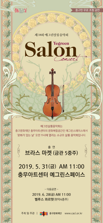 올해 4회 진행될 <예그린살롱음악회>의 첫무대는 금관5중주 앙상블 ‘브라스 마켓’이 금관악기 공연을 성보인다. 이어 6월28일 현악4중주 ‘벨루스 콰르텟’의 공연이 예정돼 있다.