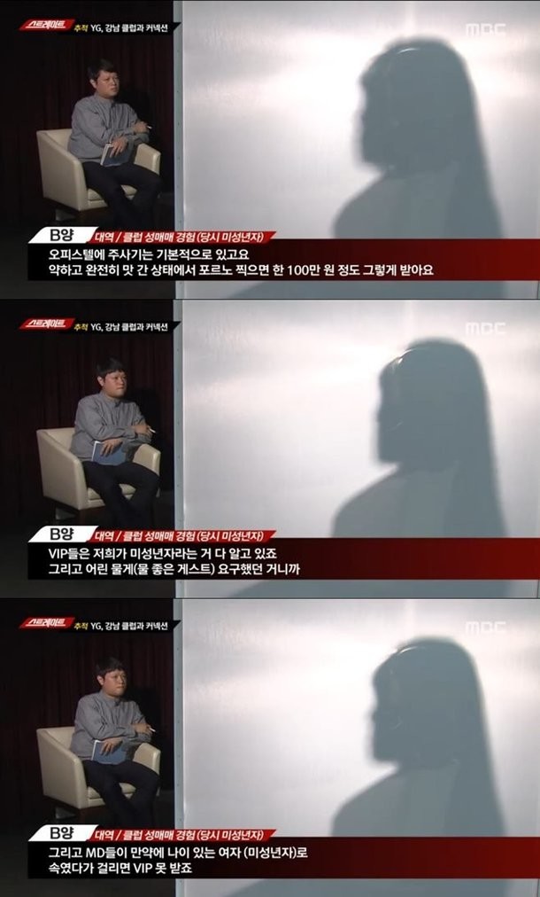 제작진은 2014년 7월, YG가 동남아시아 재력가 2명에게 성접대를 했다는 증언을 입수했으며, 성매매와 마약 등이 횡행하는 클럽 아레나 실태를 전했다.