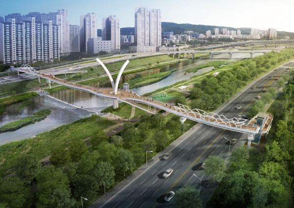총사업비 95억원 규모의 안양천 횡단보도교는 예술성과 상징성을 갖춘 1주탑 비대칭 사장교 형식의 독창적인 디자인으로 조성된다.