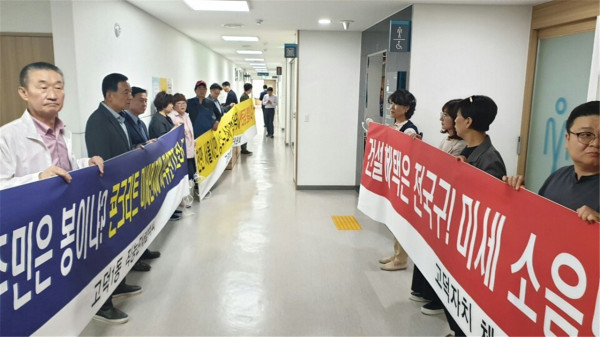 | ▲ 고덕동 레미콘 생산, 시멘트 저장시설 축조 신청에 반대하는 주민들이 항의하고 있다. (사진제공=강동구의회) | ||