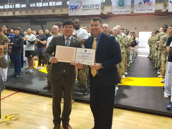 [시민일보=이대우 기자] 이관수 서울 강남구의장이 최근 경기 오산시 미군 공군기지 체육관에서 열린 ‘2019 한·미 친선 태권도 대회’에서 미국제7공군, 사령관 케네스 윌즈바흐(Kenneth S.Wilsbach)로부터 한·미 양국 간 동맹 및 우호, 문화발전에 기여한 공로를 인정받아 감사장을 받았다.