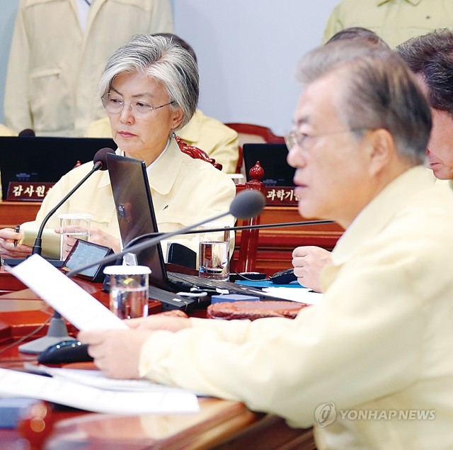 문재인 대통령이 29일 오전 청와대 여민관 영상회의실에서 열린 을지태극 국무회의를 주재하고 있다. 왼쪽은 강경화 외교부 장관.
