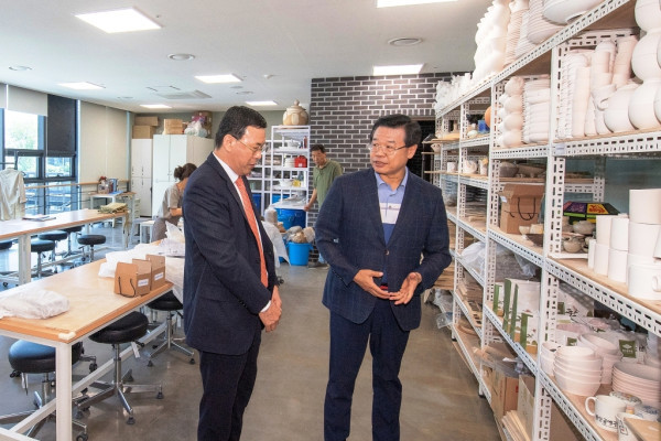 용산구가 29일 용산공예관에서 성장현 구청장과 중소기업 옴부즈만 및 관계자들이 참석한 가운데 '기업그물망 현장공감 간담회'를 개최했다. 사진은 성 구청장(오른쪽)이 간담회에 앞서 중기 박주봉 옴부즈만에게 공예관 시설을 소개하는 모습. (사진제공=용산구청)