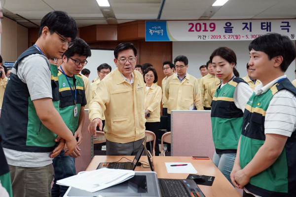 동대문구가 최근 구청 지하 2층에 마련된 종합상황실에서 유덕열 구청장 및 관계자들이 참석한 가운데 '2019 을지태극연습 보고회'를 진행했다. 사진은 유 구청장이 직원들의 근무 상황을 점검하고 있는 모습. (사진제공=동대문구청)