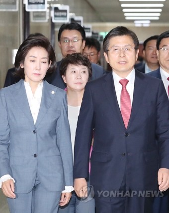 자유한국당 황교안 대표와 나경원 원내대표가 3일 국회에서 열린 최고위원회의에 들어서고 있다.