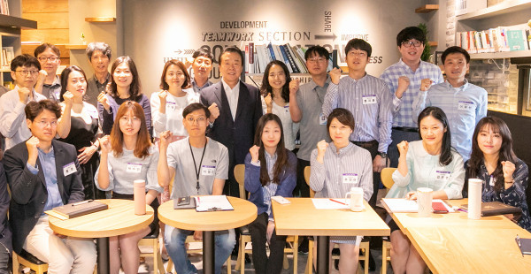 서울 강서구는 3일 구청 톡톡살롱에서 직원들이 모여 토론하며 구정 발전을 도모하는 협업 리더그룹 ‘2기 뉴런 구정 디자인단’ 발대식을 개최했다. 사진은 노현송 구청장(두 번째 줄 왼쪽 네 번째)과 디자인단 회원들이 기념촬영을 하는 모습. (사진제공=강서구청)