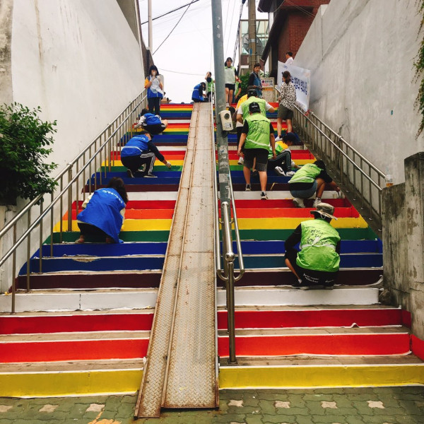 서울 양천구 목4동이 최근 지역 주민들과 함께 정목어린이공원 등 6곳의 공벽에 벽화를 그리는 ‘함께 꾸미는 희망의 벽화사업’을 진행했다. 사진은 낡은 계단에 무지개색으로 페인트질을 하고 있는 주민들의 모습. (사진제공=양천구청)