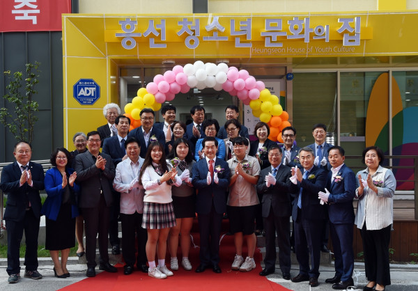 경기 의정부시는 3일 안병용 시장, 청소년 관련 단체장 등 주요내빈과 지역내 청소년들 참석한 가운데 가능동에 건립된 ‘흥선청소년 문화의집’ 개관식을 개최했다. 사진은 안 시장(앞줄 오른쪽 여섯 번째)과 관계자들이 기념촬영을 하는 모습. (사진제공=의정부시청)