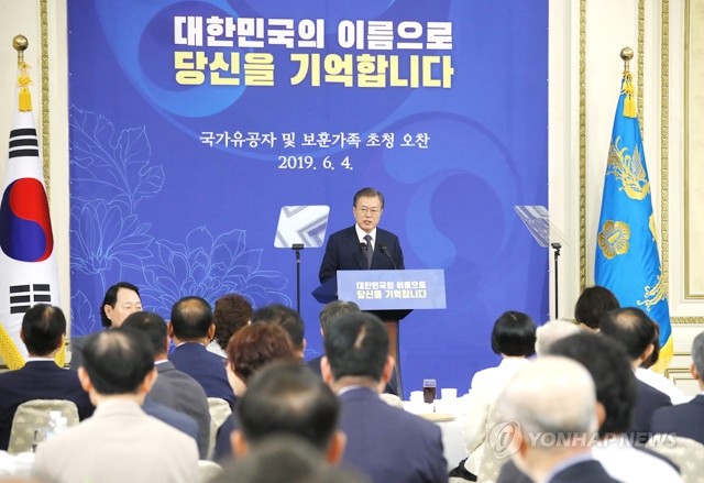 문재인 대통령이 4일 낮 청와대 영빈관에서 열린 국가유공자 및 보훈가족 초청 오찬 행사에서 발언하고 있다.