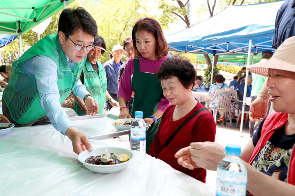 서울 성동구는 최근 구청 앞 광장에서 성동구새마을부녀회 주관으로 ‘사랑의 자장면 나눔 행사’를 개최해 지역내 소외계층 노인 등에게 자장면 1000그릇을 제공했다. 사진은 정원오 구청장(왼쪽)이 노인에게 자장면을 대접하는 모습. (사진제공=성동구청)