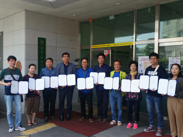 인천 계양구 계산1동 행정복지센터와 계산1동 보장협의체는 4일 복지사각지대 취약계층을 적극적으로 발굴하기 위해 지역내 고시원 12곳과 협약을 체결했다. 사진은 관계자들이 협약서를 들고 기념촬영을 하는 모습. (사진제공=계양구청)