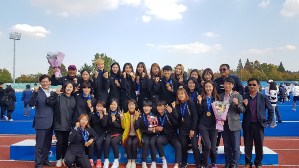 | ▲ 아산시 소속 하키팀이 2018년 전국체전 3연패 달성 후 시상식에서 기념촬영을 하고 있다. (사진제공=아산시청) | ||