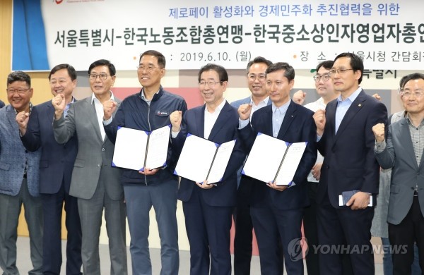 10일 오전 중구 서울시청에서 김주영 한국노동조합총연맹 위원장(왼쪽 네 번째부터)과 박원순 시장, 방기홍 한국중소상인자영업자총연합회장이 제로페이 활성화와 경제민주화 추진 협력을 위한 업무협약을 체결한 뒤 기념촬영을 하고 있다.