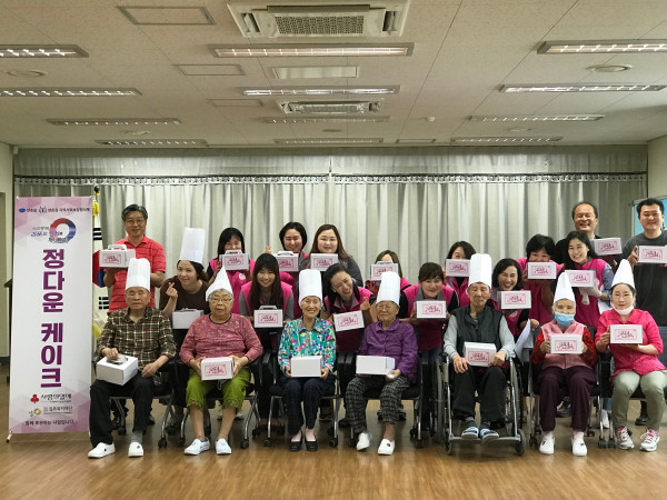경기 김포시 양촌읍 행정복지센터와 지역사회보장협의체는 10일 행정복지센터 소회의실에서 치매노인과 봉사자 등 25명이 참여한 가운데 ‘정다운 케이크 지원사업’을 진행했다. 사진은 직접 만든 케이크를 들고 기념촬영을 하는 모습. (사진제공=김포시청)