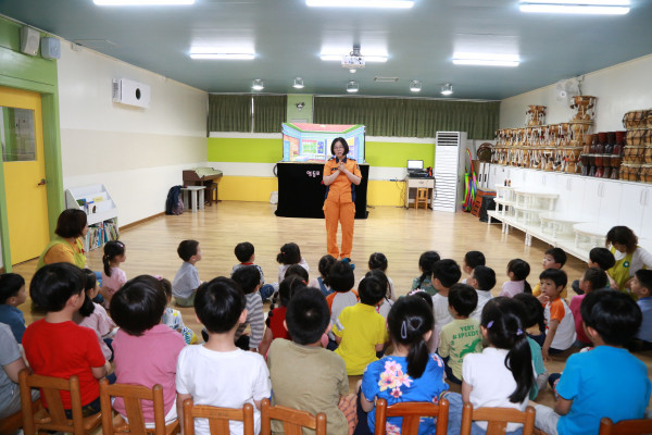영등포소방서는 최근 여의도 소재 성요셉 유치원 119소년단 어린이들을 대상으로 안전교실을 운영했다. 이날 119신고요령, 화재시 대피요령 등의 교육이 진행됐다. 사진은 소방서 관계자가 어린이들에게 대피요령 등에 대해 교육하는 모습. (사진제공=영등포소방서)