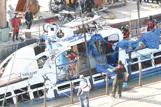 11일(현지시간) 헝가리 부다페스트 다뉴브강 머르기트 다리 아래 허블레아니호 인양현장에서 한국 신속대응팀 대원과 헝가리 대테러청 대원이 선체 수색을 하고 있다.