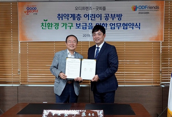 한편 기업조직문화 교육 전문 기관인 ㈜오디프랜즈는 구성원간의 신뢰와 커뮤니케이션 활성화를 높일 수 있는 차별화된 고객 맞춤형 프로그램을 제공하여 기업으로부터 큰 인기를 얻고 있다. ㈜오디프랜즈는 이번 굿피플과의 나눔파트너 협약을 시작으로 친환경 가구 사회공헌 프로젝트를 더욱 활발하게 진행해 더 많은 소외된 아이들에게 사랑을 전할 계획이다.