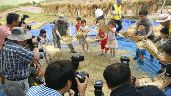12일 서울 서초구가 주민들에게 도심 속에서 농사체험 기회를 제공하기 위해 양재천교 옆에 조성된 보리밭(530㎡)에서 ‘2019 양재천 보리수확 체험행사’를 실시했다. 사진은 키질을 체험하고 있는 어린이들의 모습. (사진제공=서초구청)