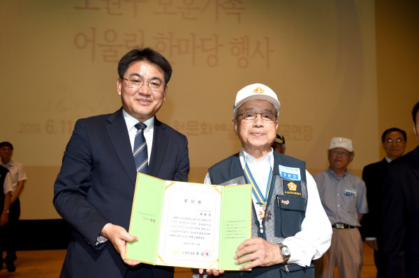 노원구가 11일 문화예술회관 대공연장에서 지역내 보훈대상자와 가족 등이 참석한 가운데 ‘호국보훈가족 한마당 어울림행사’를 개최했다. 사진은 오승록 구청장(왼쪽)이 보훈대상자에게 표창을 수여한 후 기념촬영을 하는 모습. (사진제공=노원구청)