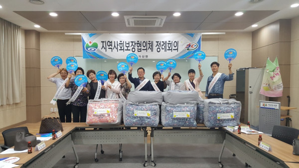 경기 포천시 가산면 지역사회보장협의체는 11일 복지사각지대 발굴을 위한 홍보 캠페인 및 '사랑의 여름이불 나누기 행사'를 개최했다. 이날 여름 이불을 구매하고 세탁한 후 홀몸노인 등의 저소득가구에 직접 전달했다. 사진은 기념촬영을 하는 모습. (사진제공=포천시청)