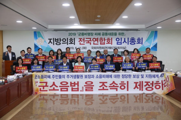 경기 수원시의회 의원들은 최근 국회의원회관에서 열린 군용비행기 소음피해지역 지방의회 전국연합회 임시총회에 참석해 군용비행장 소음피해 관련법 제정을 촉구했다. 사진은 조 의장(오른쪽 다섯 번째)과 의원들이 손팻말을 들고 있는 모습. (사진제공=수원시의회)