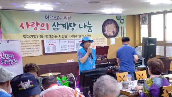 경기 남양주시 철마기업인회 ‘함께하는 사람들’은 12일 홀몸노인 등 지역내 노인 50여명을 초청해 점심식사를 대접했다. 이날 자원봉사자 10명은 노인들과 담소를 나누고 삼계탕을 대접했다. 사진은 김종필 대표가 인사말을 전하는 모습. (사진제공=남양주시청)